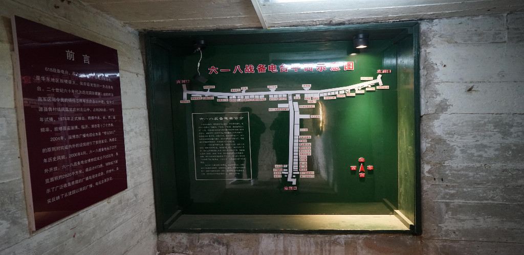 山洞洞口顶部由原木装饰而成,四周堆砌沙袋,左边是检票的房屋,经过核验门票后,我们穿过钢筋防核拱门弯腰进入山洞,然后是一条长长的拱形坑道走廊。坑道拱洞走廊大约有两米左右宽,两侧被用水泥墙壁间隔成大小不一、功能各异的生活或工作的房间,有警卫室、作战室、会议室、食堂、洗漱间,播音室等,一些房间内陈列着许多的老式广播设备、军用电台、军用枪械、通讯设备等文物。洞的尽头再上台阶是一条横着的坑道,两条坑道一高一低,总体呈“T”形排列。横着的坑道洞内,主要是电视发射装置以及柴油发电机、电动鼓风、直流电瓶室,空气净化等大型设备,还有台长室、职工宿舍、洗浴室、水池等等,面面俱到,应有尽有。