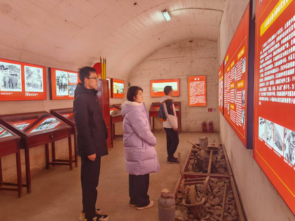 坑道内的光线略显昏暗,墙壁上的灯光映照着岁月的痕迹。在坑道中漫步,时间仿佛凝固。参观过程中,老旧的播音设备、泛黄的工作日记、墙上的保密标语,都让大学生们驻足沉思、轻声交流。有的轻轻抚摸依山而建的防空洞墙壁,有的凑近斑驳的广播机房玻璃窗仔细观察,还有同学用手机拍摄老旧的发射设备,这些痕迹无不诉说着那段隐秘而光荣的三线岁月,也让大家直观感受到了当年建设者们的艰辛与坚守。